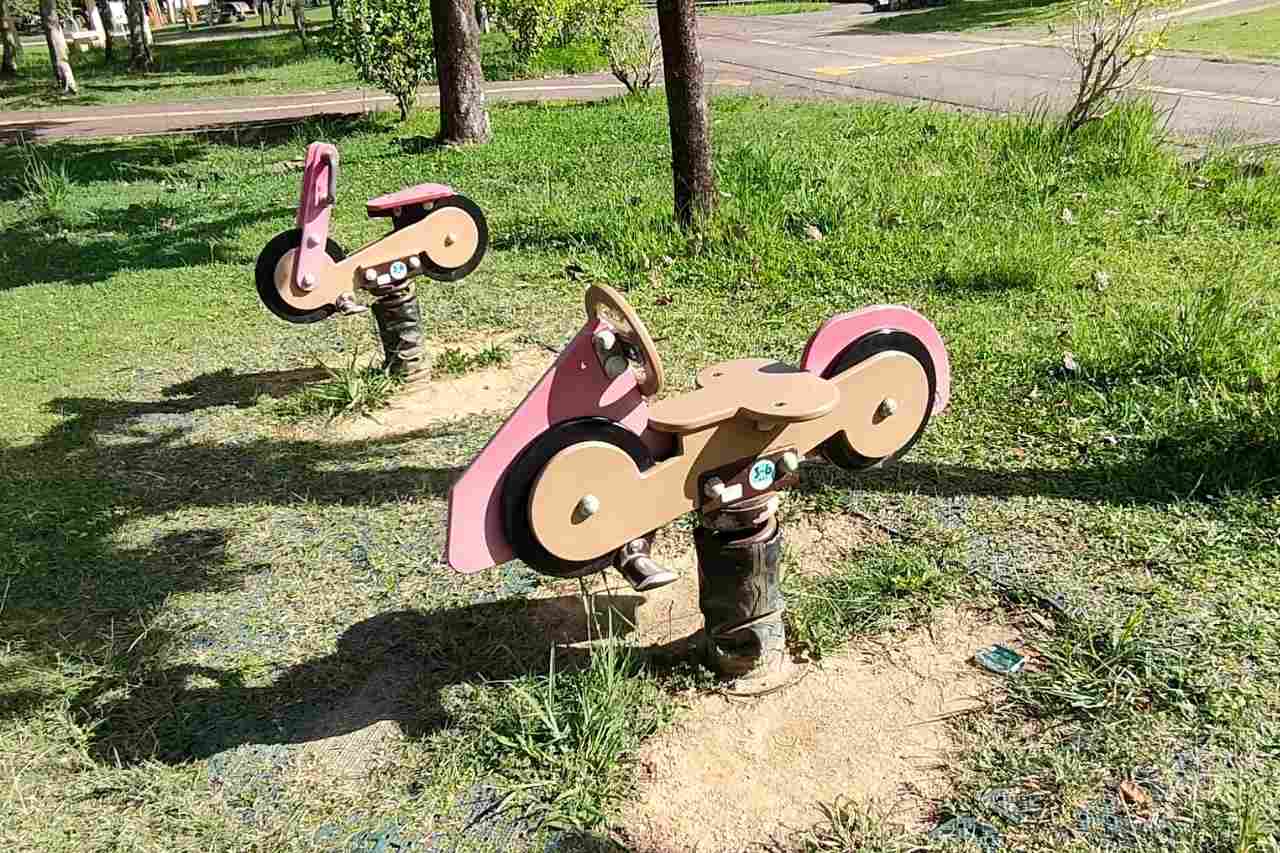 幼児向けのスプリング遊具もあります。乗りもの好きなお子さんにはたまらないバイクのデザインです。ほかにはうんてい棒や鉄棒、シーソーなどの遊具も楽しめます。