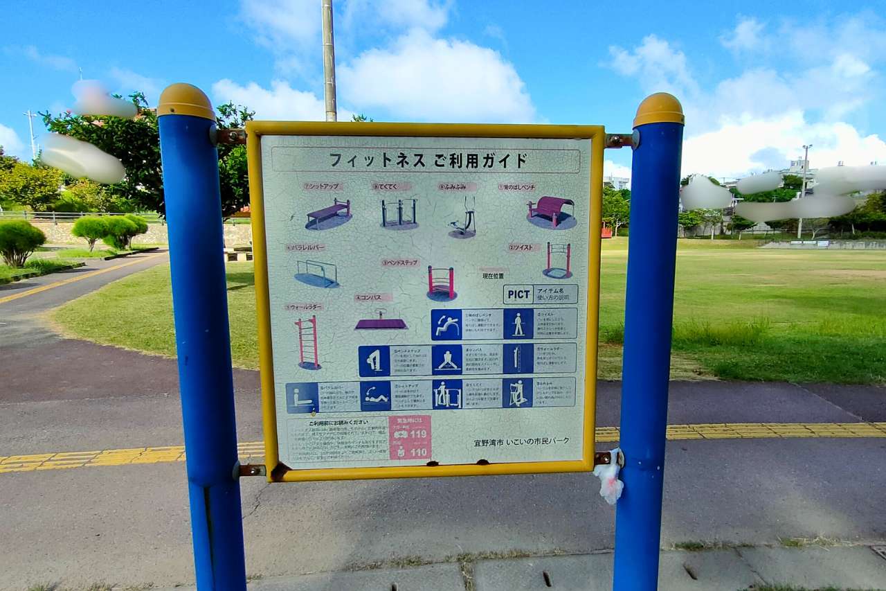 器具の使い方がわからない!と思ったときは、近くの看板で使い方が確認できます。看板には9種類の器具が紹介されていますが、実際にあるのは8種類です。(2025年8月現在)