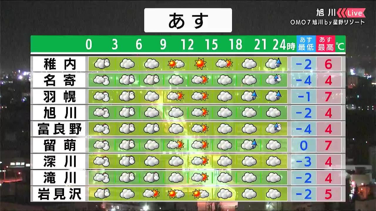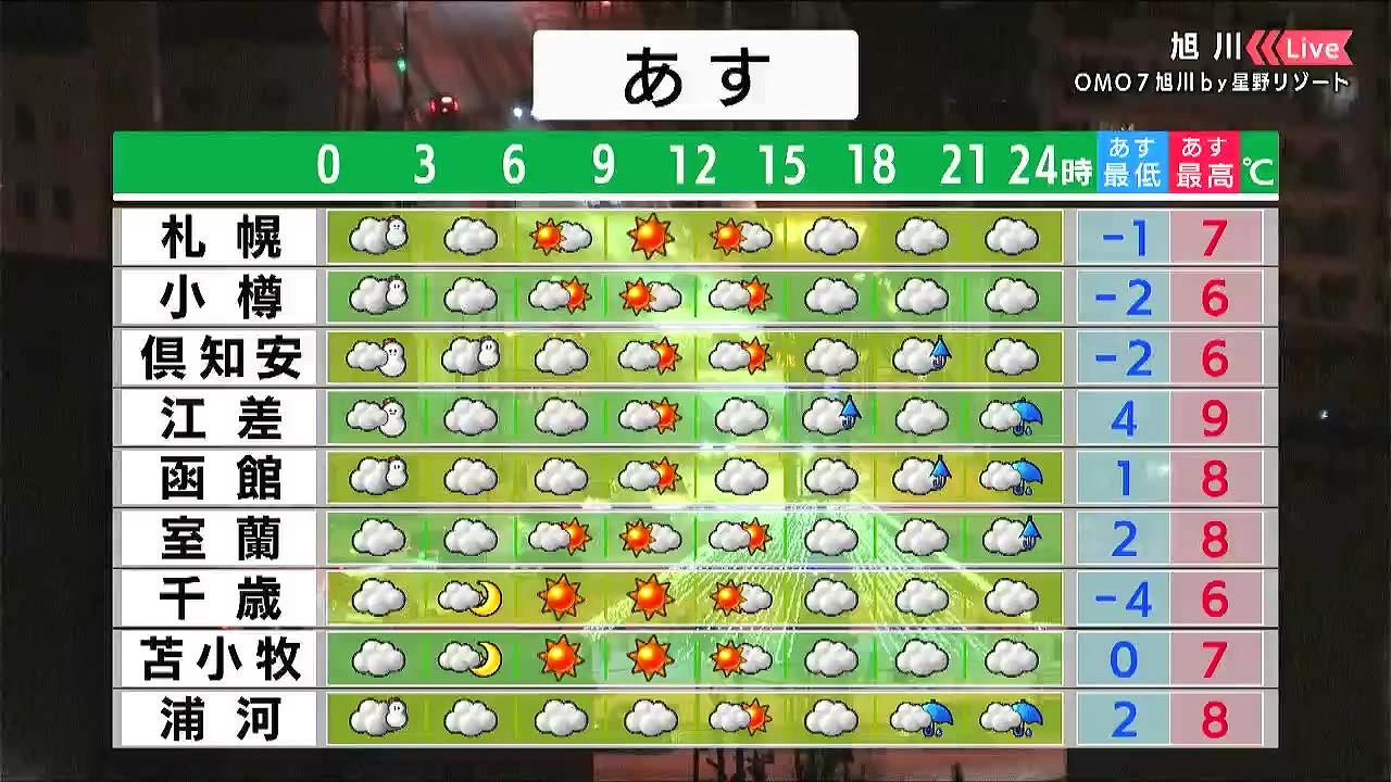 朝には雪はやみ、昼頃は晴れ間が出ます。夕方以降は倶知安や道南方面で雨が降るでしょう。札幌も夜は小雨がぱらつくかもしれません。江差の最高気温は9度でしょう。