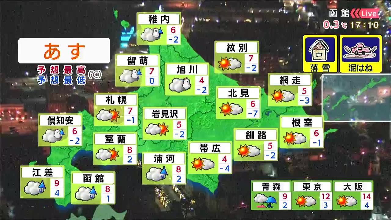 しだいに雪はやみ、日が差しますが、午後は道北や道南を中心に雨が降るでしょう。気温はきょう5日(金)より5度前後高くなります。落雪や泥はねに注意して下さい。