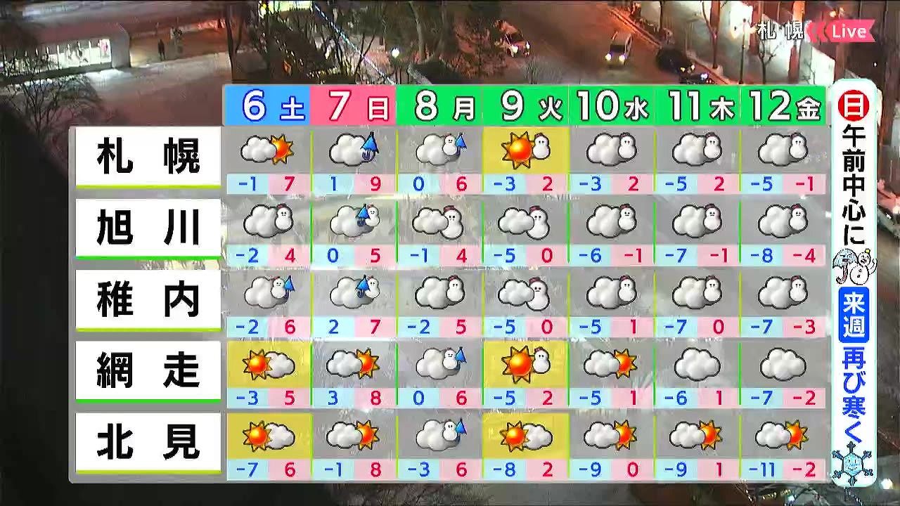 日中は各地で晴れるでしょう。風も弱まりますが、路面凍結に引き続き注意が必要です。今朝、この冬最低となる‐12.5度まで下がった北見のあす6日(土)朝は-7度の予想です。