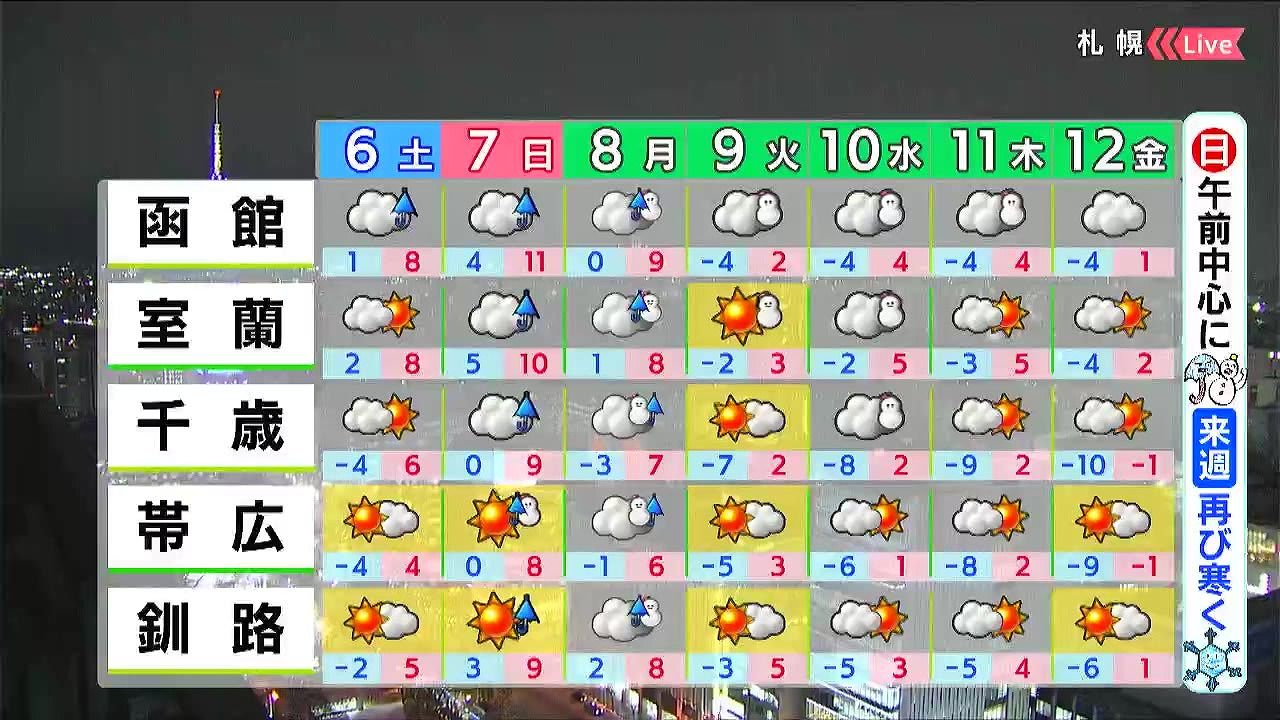 日曜は札幌で9度まで気温が上がりますが、道北を中心に雨や雪が降り、札幌も昼頃までにわか雨があるでしょう。月曜の雪や雨のあと、再び冬らしくなります。
