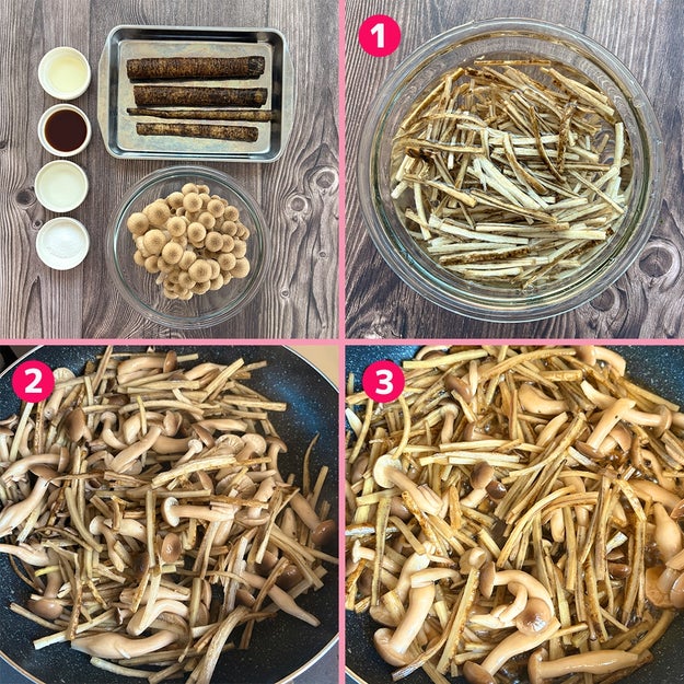 ① ごぼうは包丁の背で表面をこそげ取り、細切りにして5分ほど水にさらす。しめじは石づきを切り落とし、食べやすい大きさにほぐす。