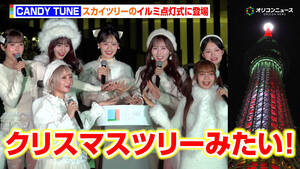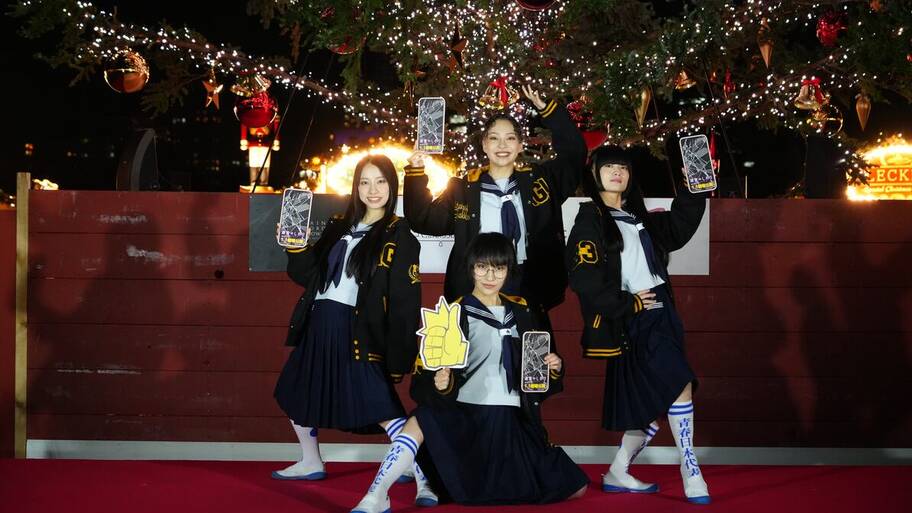 クリスマスツリーの点灯式に、主題歌担当の新しい学校のリーダーズ(MIZYUさん、RINさん、SUZUKAさん、KANONさん)と河森正治監督が登壇しました。
