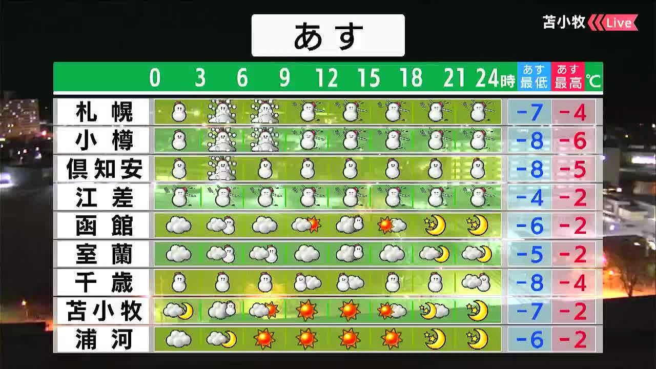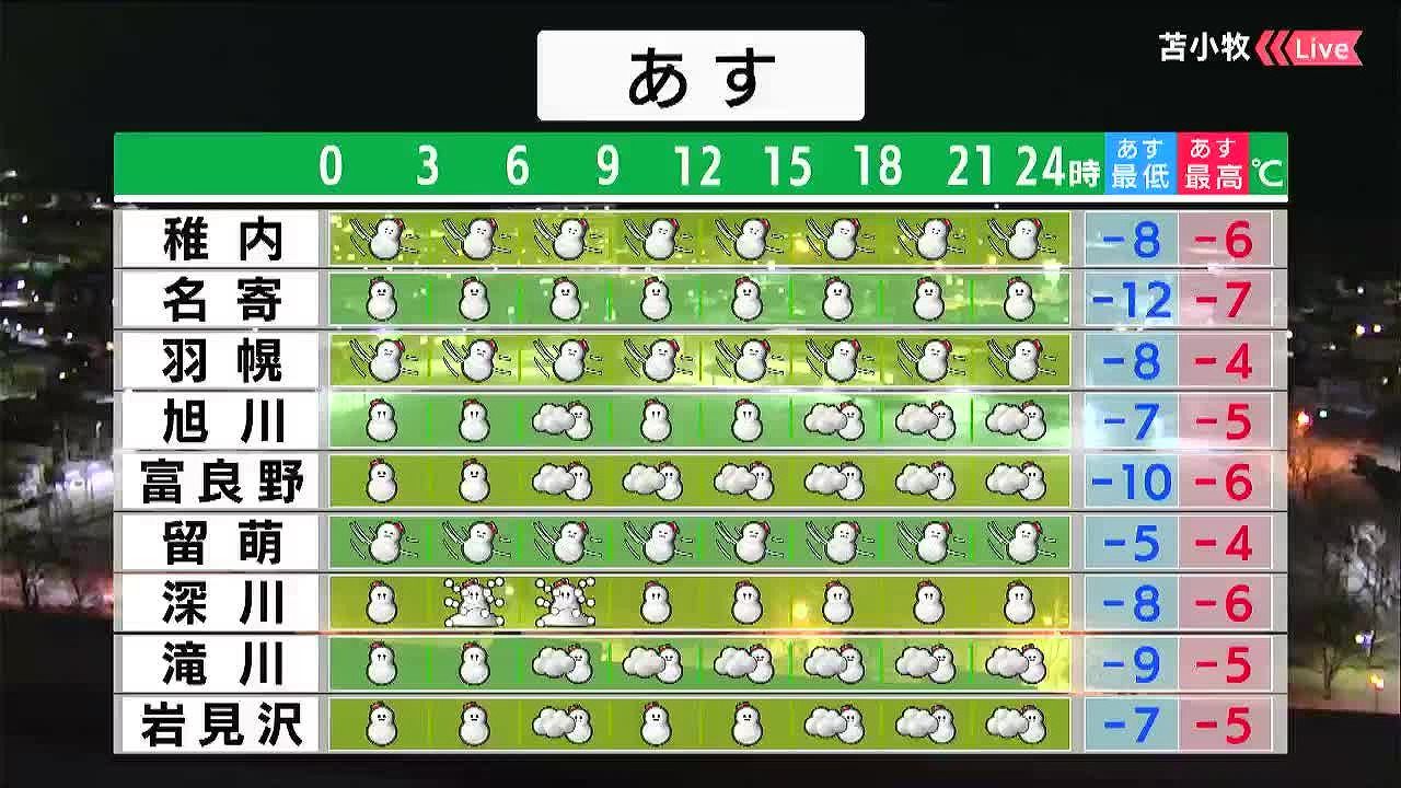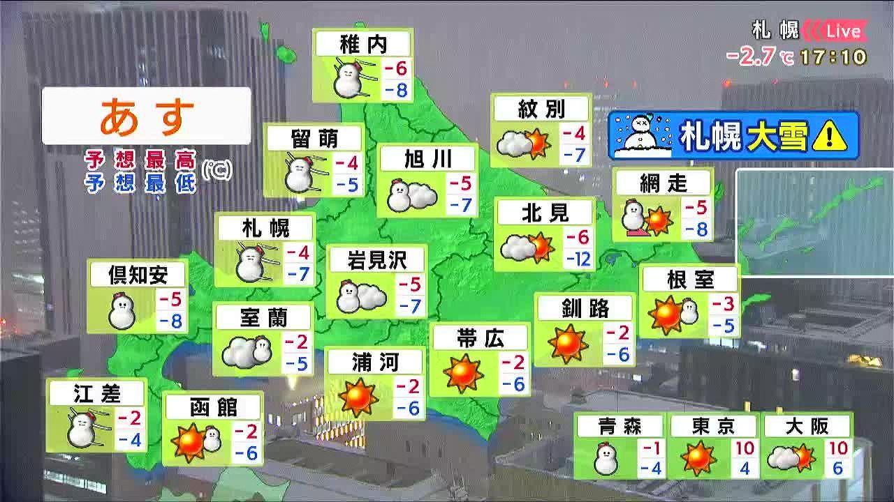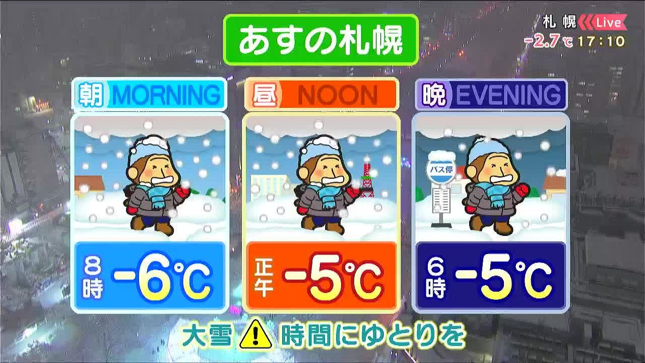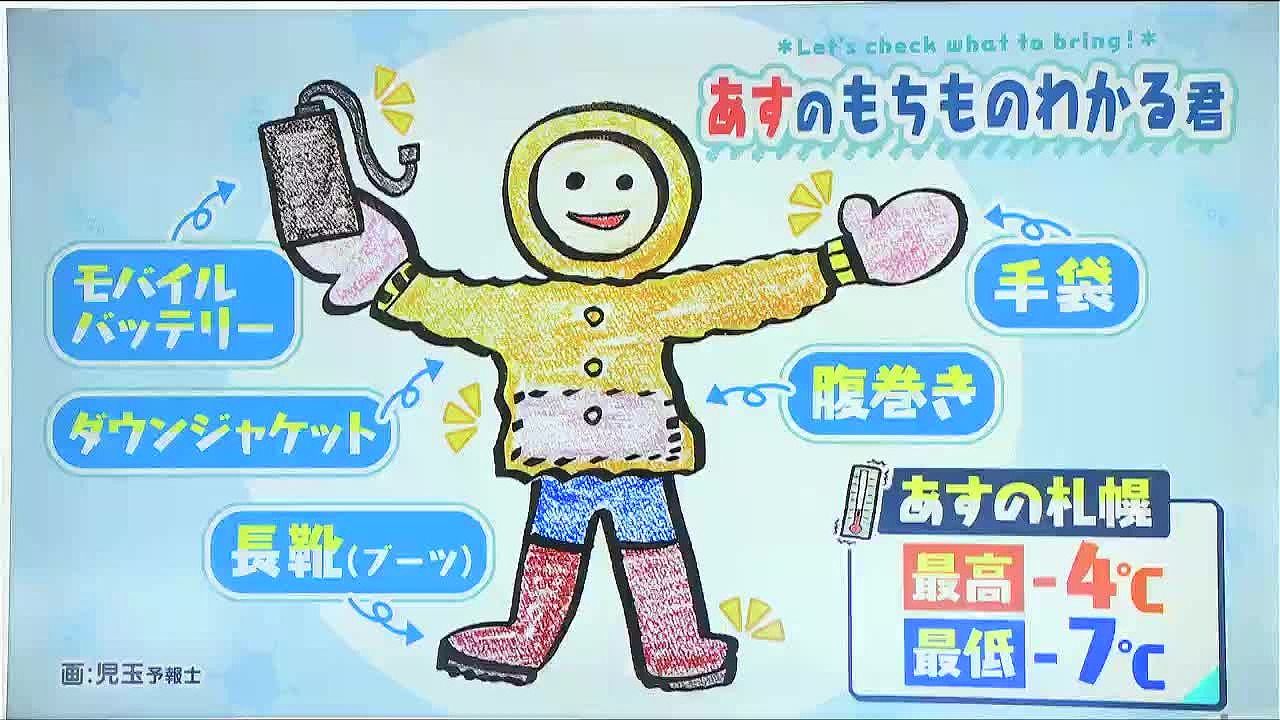大雪だけでなく、あすは各地でこの冬一番の寒さです。札幌の最低気温は-7度、最高気温は-4度で真冬の防寒、ダウンジャケットに手袋、腹巻きも体を温めてくれるのでオススメです。大雪にもなるので、長靴を履いています。