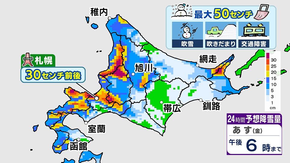 あす午後6時までの24時間に降る雪の量です。日本海側や知床半島を中心に雪が降ります。赤や紫、知床半島や留萌から深川にかけて、小樽・札幌から恵庭、長沼、風が強いので胆振の安平町周辺にかけて30センチ前後の雪が降り、局地的に50センチのドカ雪です。大雪や吹雪、吹きだまりによる交通障害に注意してください。車には除雪用のスコップなどを積んでおきましょう。雪だけでなく、あすは寒さも厳しくなります。