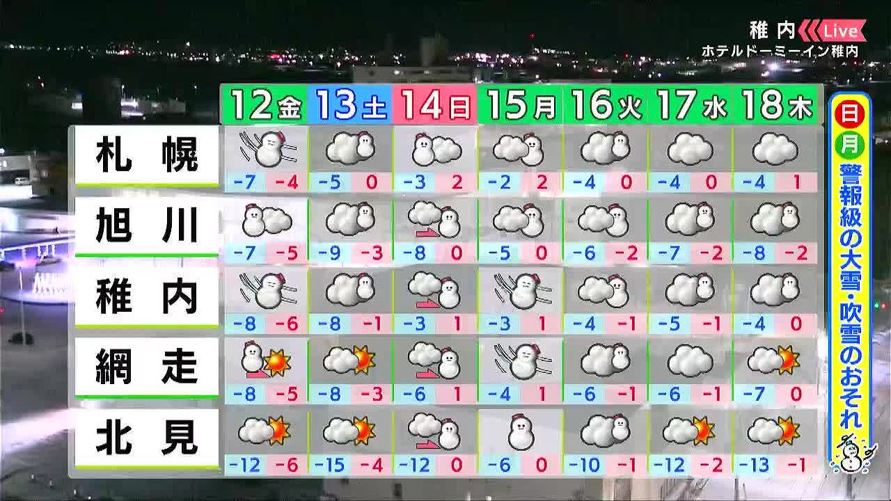 札幌を含む日本海側や知床半島周辺で大雪や吹雪、吹きだまりによる交通障害に注意が必要です。最高気温は各地でマイナスの真冬日になるでしょう。