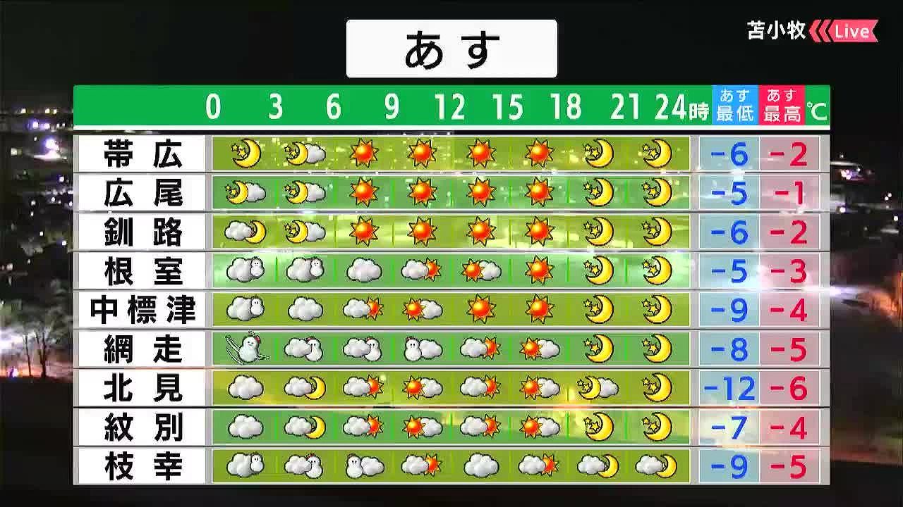 土曜は穏やかですが、朝の冷え込みが強まり、海岸部の釧路でも‐11度です。日曜は東部を中心に猛吹雪や警報級の大雪となるおそれがあります。