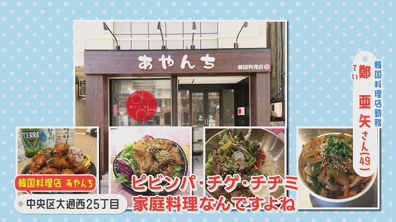 番組スタッフ:「どんなもの食べられるんですか?」亜矢さん:「ピビンパ、チゲ、チヂミ?家庭料理なんですよね、うち。向こうのおばさん、お母さんとか、おばさんたちに教わってきたものを出して…」
