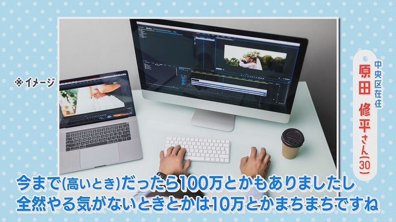 番組スタッフ:「その仕事でどれぐらいの収入があったりするんですか?」修平さん:「僕がやる気を出すかどうかでしかないんですけど、今まで(高いとき)だったら100万とかもありましたし、全然、全然やる気がないときとかは、10万とかまちまちですね」