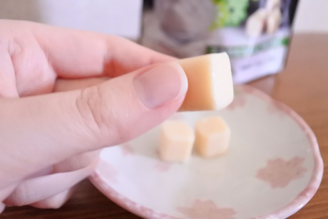 サイズは約1.5cm角のサイコロ型。見た目は、ヨーグルトと生クリームを思わせる乳白色です。開封すると、ヨーグルトのような爽やかな香りがふんわりと広がります。