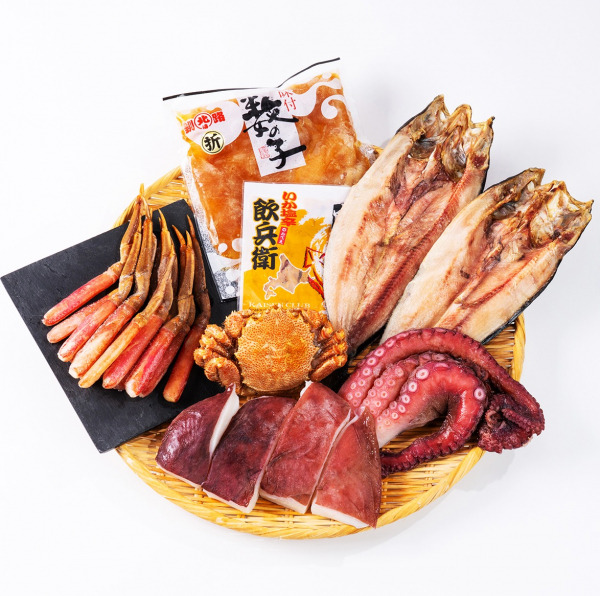 【内容】ズワイ蟹ハーフカット350g、タラバ蟹カット300g、鮭スモーク100g真ほっけ1枚、いか塩辛150g、さんま甘露煮ピリ辛180g、いか一夜干し1枚