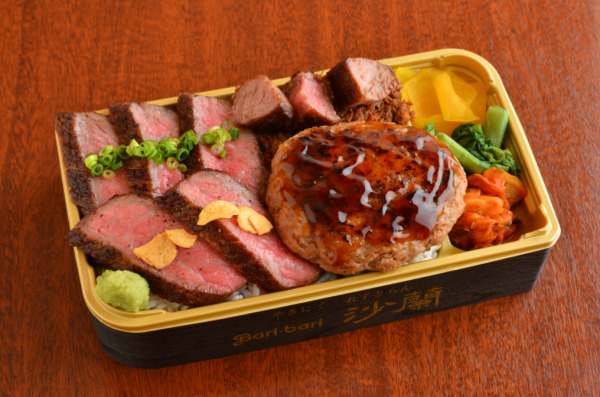 道産牛ステーキと黒毛和牛のハンバーグを盛り合わせた肉づくしなお弁当。