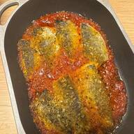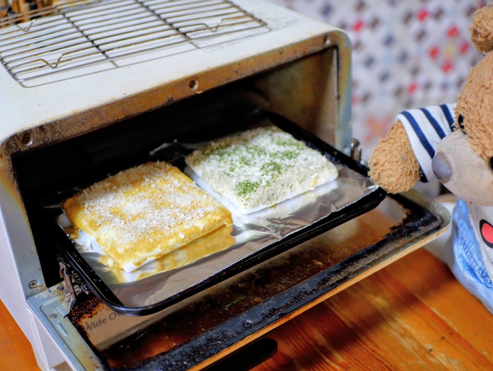 4. トースターの天板に3をのせて、5〜6分くらい焼く。パン粉がほんのりきつね色になるまで焼くよ!