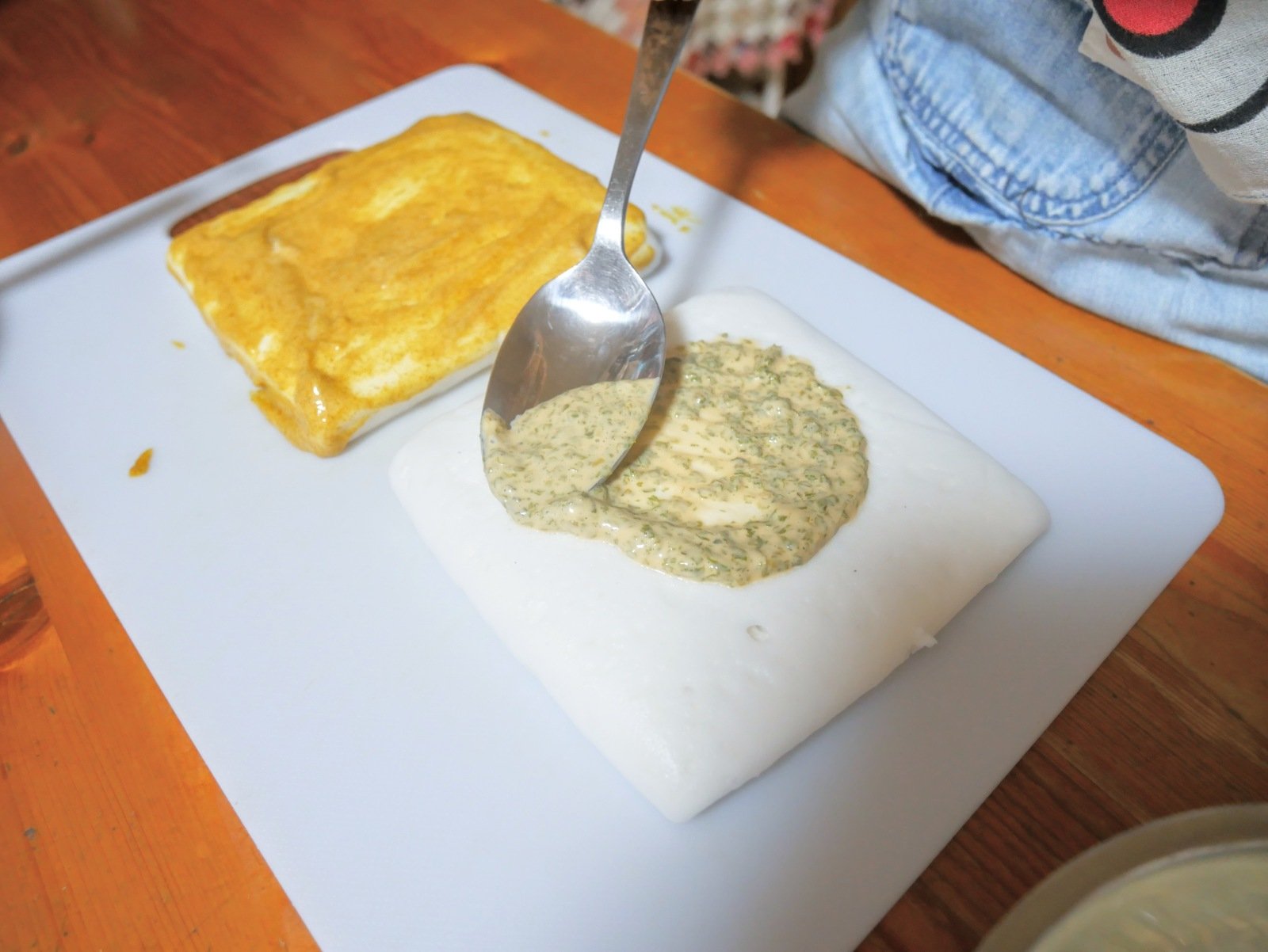2. はんぺんの表面にマヨソースをそれぞれ全量塗り広げる。