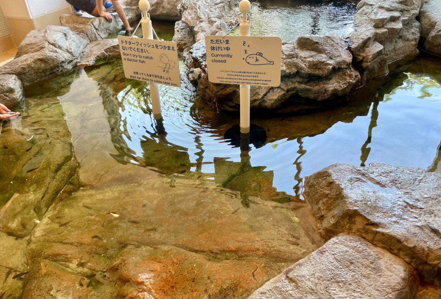 「ふれあいの磯」では、ただ触れるだけでなく、裸足で水の中に入れる“ジャブジャブタイム”もありました。休憩中との立て看板もあり、魚への配慮が為されているのも見受けられます。