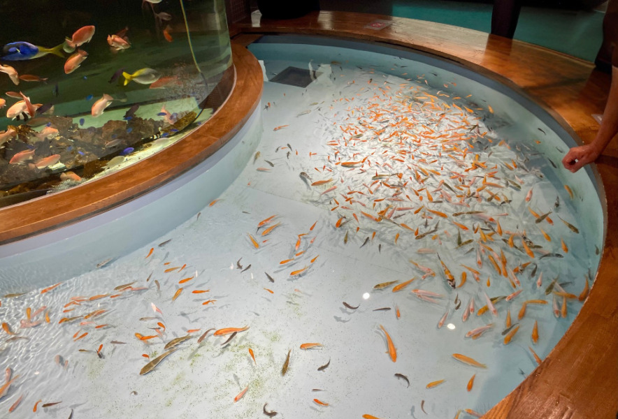 さらに、こちらでも生き物と触れ合える展示があります。水の中に手を入れるとたくさんの魚たちが集まり、特別な体験を楽しむお客さんの声で賑わっていました。