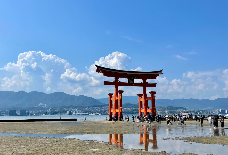 厳島神社は、平清盛に由来する世界遺産で、海上に立つ朱色の回廊が美しい神社です。引き潮時には大鳥居まで歩いて行けるため、鳥居の真下まで寄り道をしながら水族館を目指すのもおすすめです。