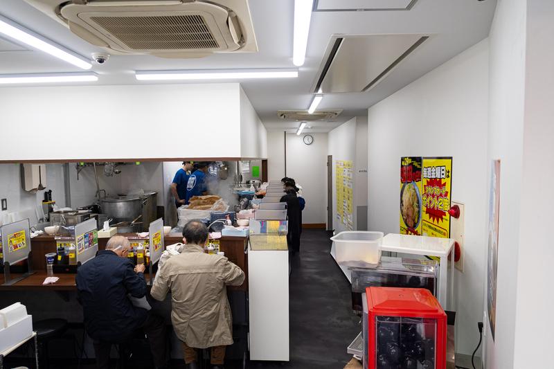 店内は以前よりも広く、カウンター席中心の構成。白い壁と明るい照明で、以前よりもクリーンな印象です。厨房の様子も見え、活気ある雰囲気が伝わってきます。