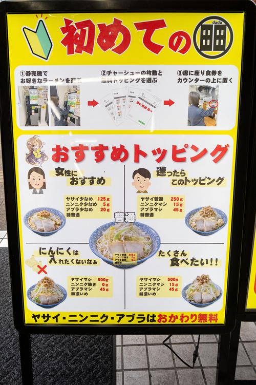 入口には「初めての田田」と題した案内があり、ヤサイ・ニンニク・アブラの量を写真付きで説明。どれくらい頼めばいいのか分かりやすく、初来店でも安心です。
