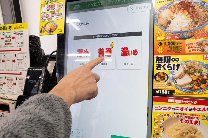 券売機では、味の濃さやトッピング量などを細かく選択可能。口頭でコールする必要がなく、落ち着いて注文できるのがうれしいポイントです。操作も直感的でわかりやすい仕様になっています。
