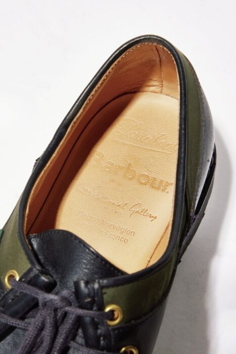 ベースはミラボーで、履き口にバブアーのオイルクロスを配したデザイン。また同社のブラス製ジッパーをイメージして、ハトメに真鍮パーツを使うなど、細かなこだわり。