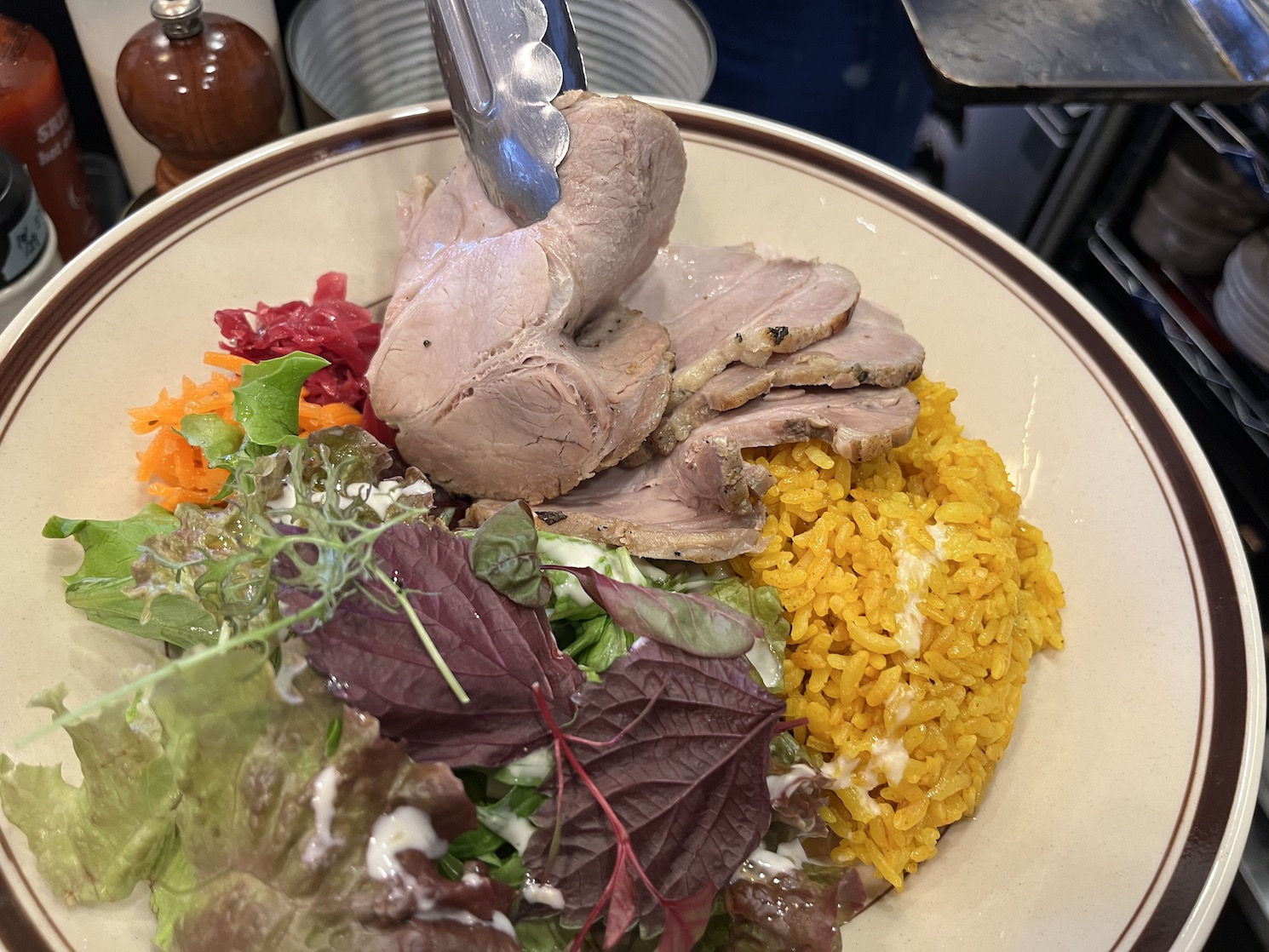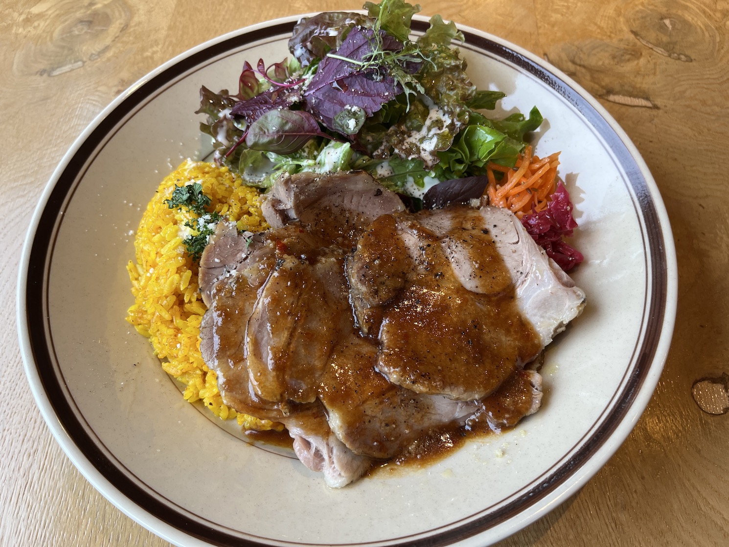 看板のローストポークとターメリックライス。付け合わせのマイクロリーフ、クミンとアーモンドを加えたキャロットラペ、マイルドな酸味の紫キャベツのラペがひと皿に盛られ、彩りの良さが自然と食欲を誘う。