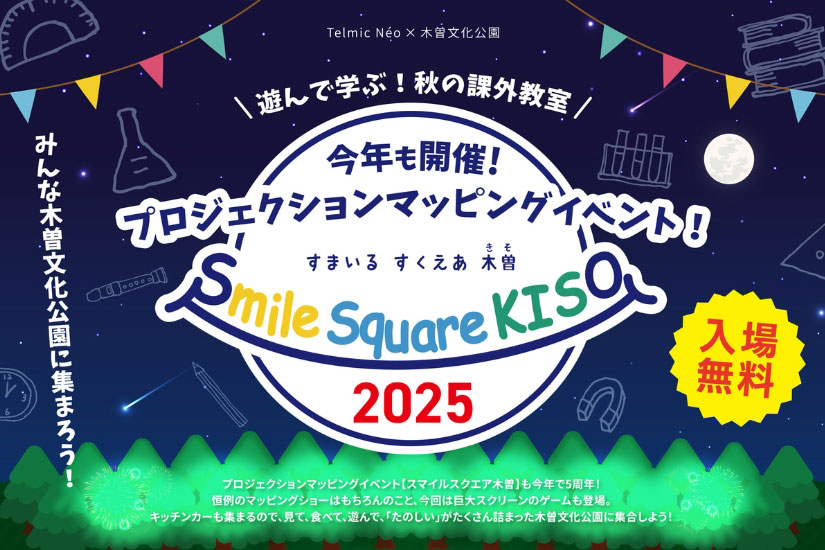 2025年11月15日(土)、11月26日(日)に長野県木曽町の「木曽文化公園」の屋外会場(創造の原)で、プロジェクションマッピングイベント『スマイルスクエア木曽2025』が開催。2021年から始まり、今年で5周年を迎えるイベントで、今年は「学問の秋」がテーマ。遊びながら学ぶ課外教室がコンセプトで、専用のマットセンサーで全身を使って遊ぶ『巨大スクリーンゲーム』やスマホ片手に園内を巡ってクイズに答える『謎解きデジタルスタンプラリー』などが登場。