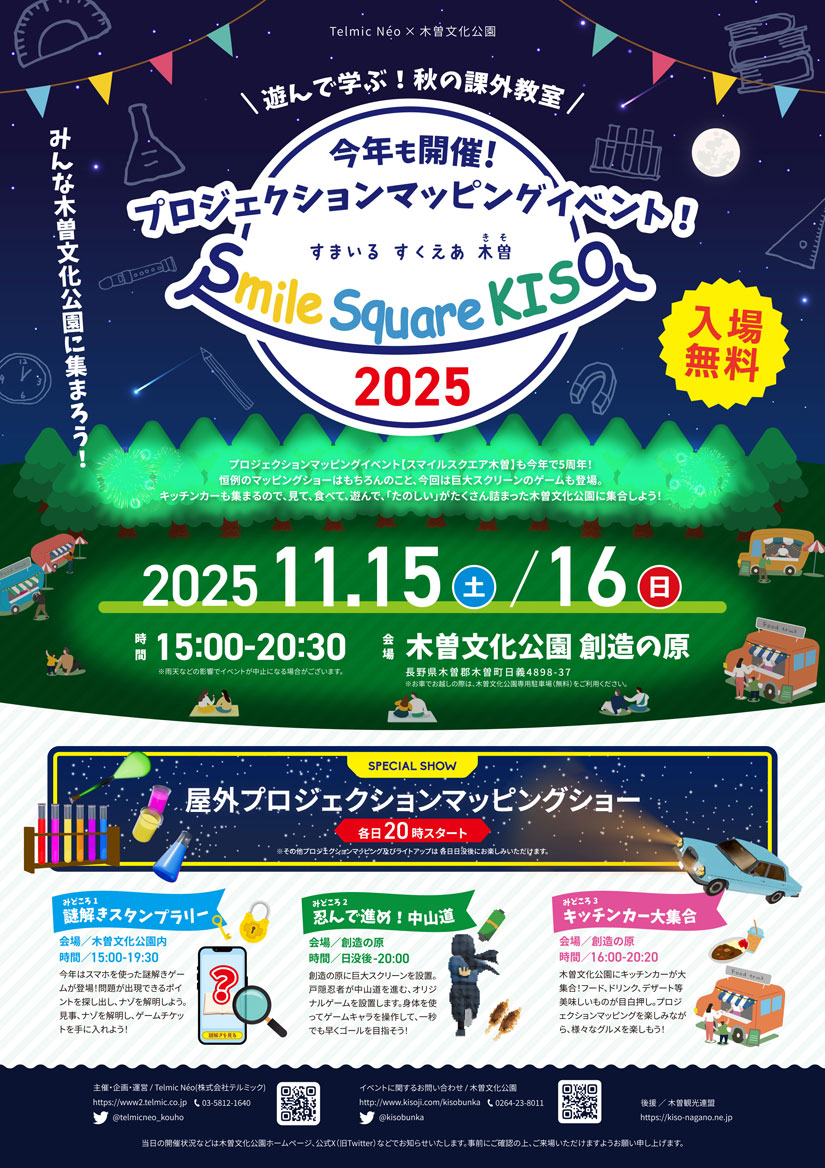 11/15(土)11/16(日)『Smile Square Kiso2025(スマイルスクエア木曽)』プロジェクションマッピング×謎解き×巨大スクリーンゲームで木曽文化を遊びながら学ぶ!キッチンカーも登場@長野県・木曽町
