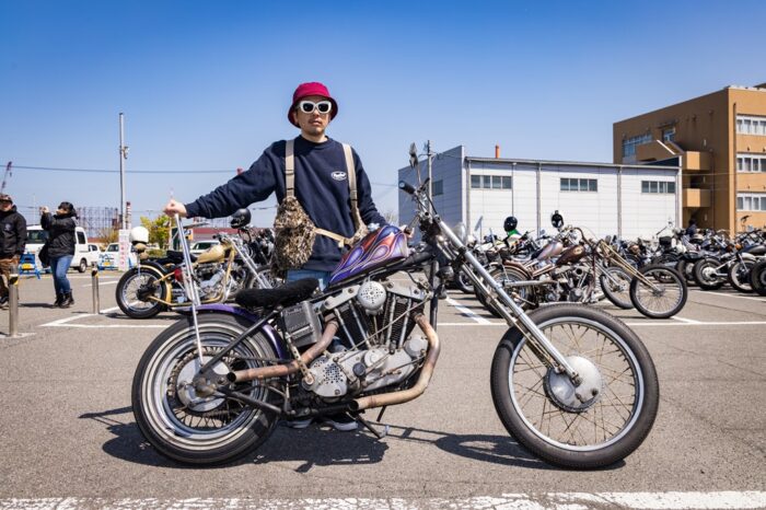 「ランブリングウィーラーズ」に東京から自走で参加した中村さん。都内在住のため車体は細身に仕上げているという。ハーレーTにブルコのパンツ、足元がコンバースという抜け感ある着こなしが、西海岸のバイカーを感じさせる。