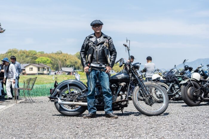 「できるだけナローなB級チョッパーを目指している」と語る小松さん。シッシーバーとマフラーは自作の溶接によるもの。全身フラットヘッドで統一し、バランスのいい着こなしがポイントだ。茶色のシングルライダースも深い味わいのエイジングで、車両の迫力あるヤレ感と見事に調和している。