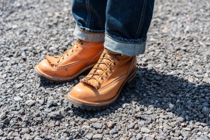 FXRTに乗る溝内さんはワックスキャンバスのウィルスジャケットとウエスコを愛用するオレゴンスタイル。ヌメ革のジョブマスターは着用3週間ですでに色の深みを増し、飴色へ進化の兆しを見せている。