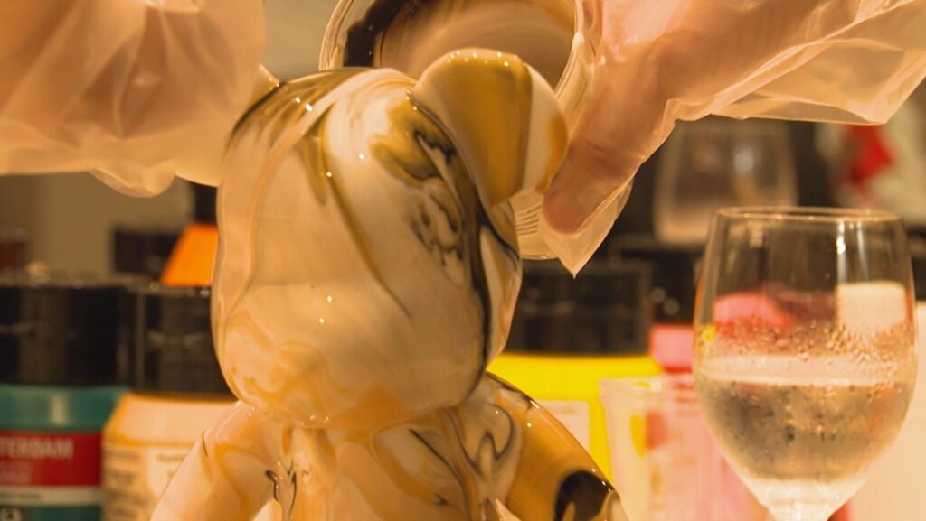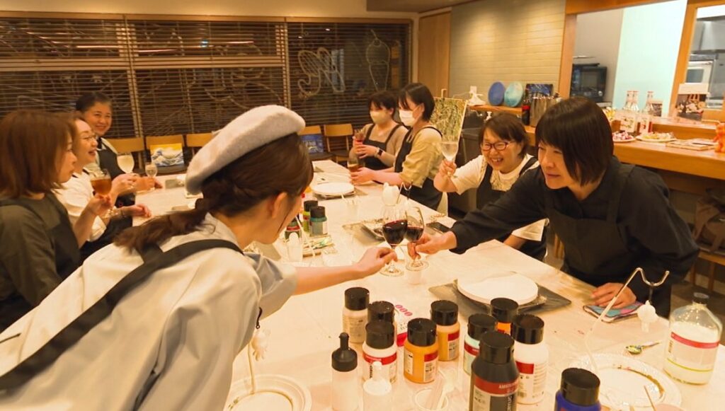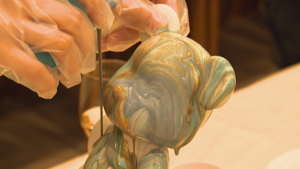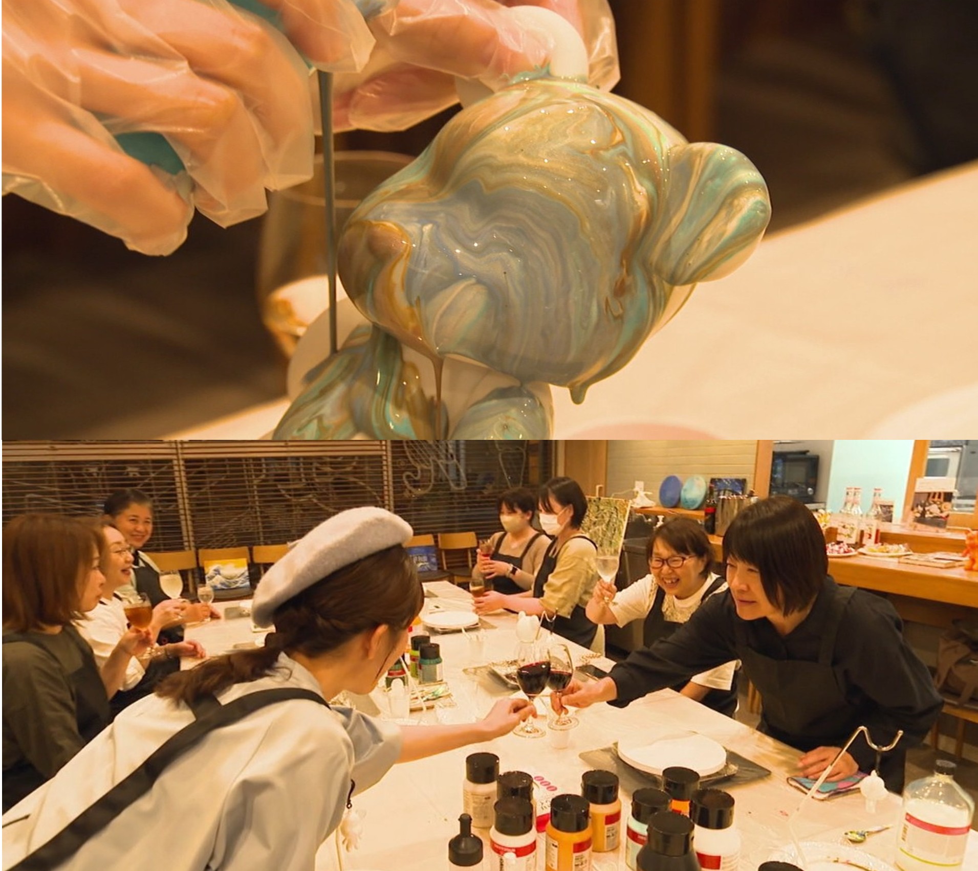 イベントは参加者全員の乾杯でスタート。参加費は1人6600円(画材・ドリンク代込み)です。この日はベアアート。クマのフィギュアに自由にペイントするアート体験です。お酒を飲みながら、好きな色の絵の具を混ぜて、マーブル模様を作ります。それをフィギュアに垂らして・・・。自分だけの「ベア」が完成です。