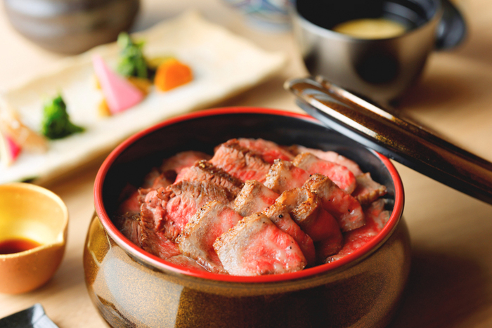 絶妙な加減で炭火焼きした能登牛をご飯の上に敷き詰め、醤油や薬味、出汁で何通りもの味わいが楽しめる一膳を、築130年越えの趣きある古民家を改築した趣ある空間で味わえるお店です。