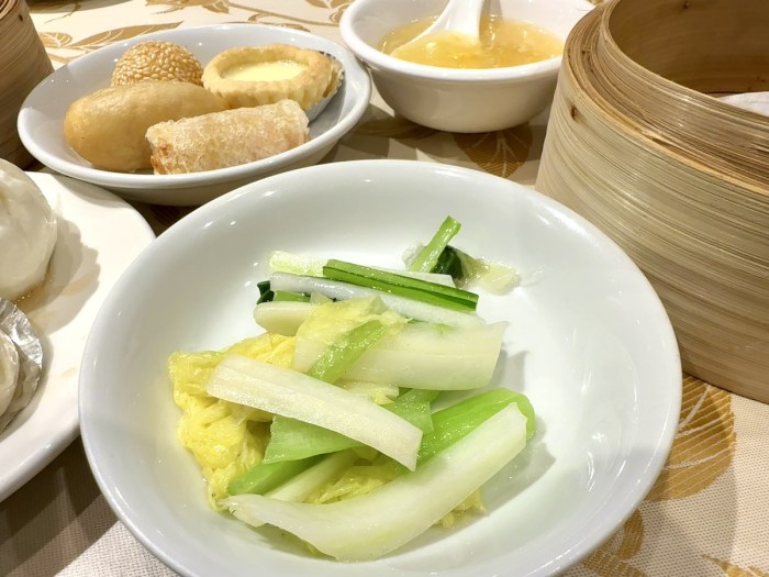 そうこうしているうちにテーブルには次々料理が届く。セイロに入った蒸し物も、テーブルに並べられた中から好きなものを選ぶ。食べたいものがなかったら、もちろんお断りしてもいい。肉まん2個は多いと思ったので尋ねたら、すぐに1個に減らしてくれた。