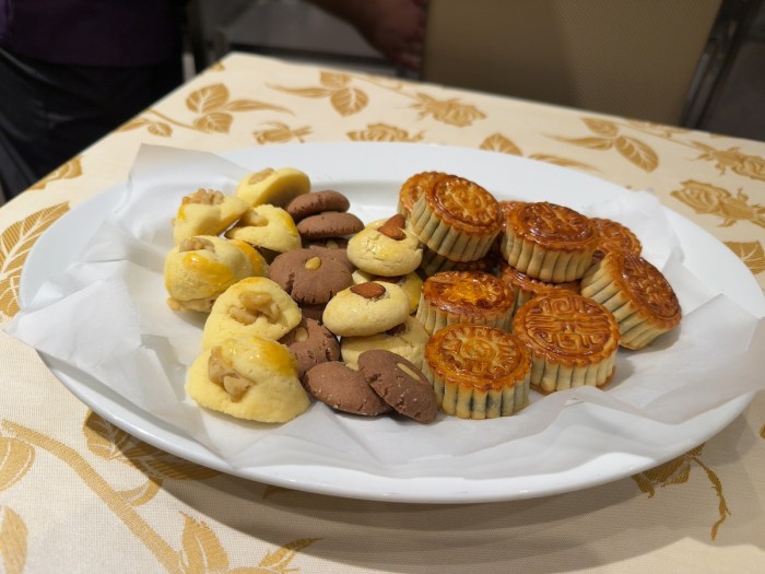 最後のデザートタイムに突入! 各テーブルの進行状況に応じてデザートが始まるので、ここは急がなくても大丈夫。クッキーや月餅などの焼き菓子、杏仁豆腐やタピオカミルクのような冷製デザートが、これまたずらりと並べられる。