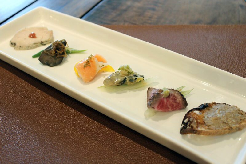 ランチコースは3300円と5500円の2種、コースのほかに単品でカレーやパスタなどもあります。今回いただいたのは3300円のコース。スタートは6種のアミューズが盛り合わされたプレート。「とりハム」「ローストビーフ」「かきのコンフィ」「リエット」「サーモンのマリネ」「レバーの赤ワイン煮」と、手間暇かけて作られた料理が並び、ひと口サイズながら、それぞれに素材の主張を感じるしっかりとした味わいです。