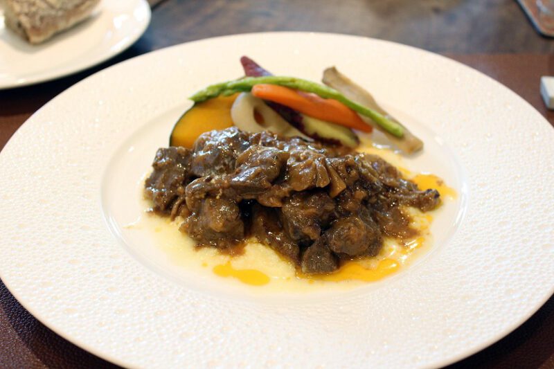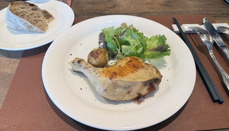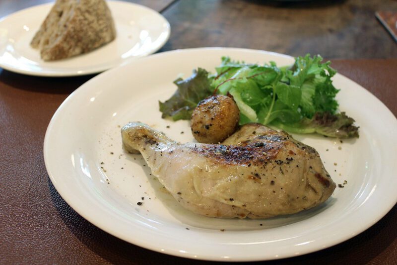 この日のメインは「若どりのコンフィ」と「牛すね肉のストロガノフ」の2種からセレクト。この日は3名で訪れたので両方をオーダーしました。通常はこの2種の肉料理に魚料理が加わり3種から選べるそうです。「若どりのコンフィ」はお客さんの8割が注文するという看板メニューで、オイルで煮るという調理法も見た目もシンプルな料理ですが、仕込みから調理、寝かせるまで3日間かけてじっくり作られているそうで、深みのある味に仕上がっています。