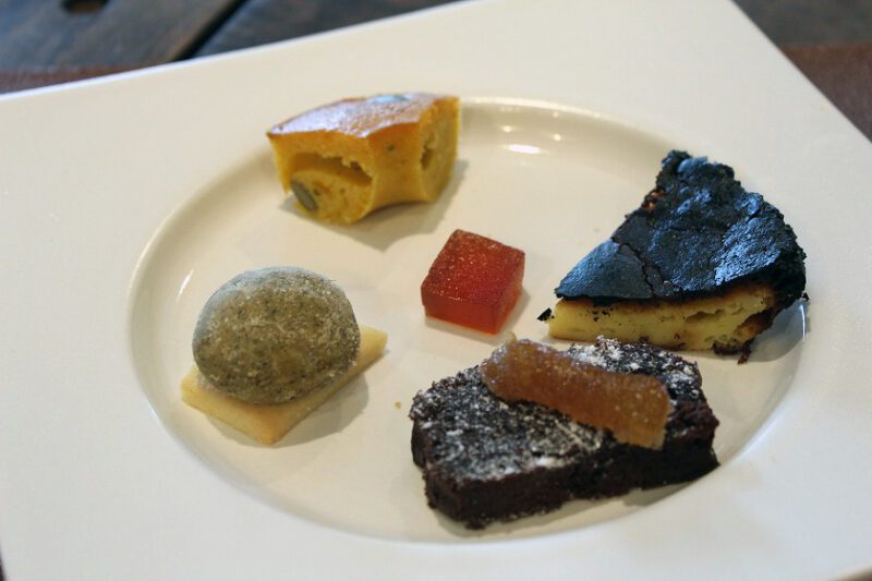 といいつつも、やっぱりデザートは別腹。5種も盛られたデザートにテンションが上がります。手間から半時計回りに、小麦粉をいっさい使っていない「ガトーショコラとオレンジピール」、焦げが香ばしい「バスクチーズケーキ」「かぼちゃのドーナツ」「ほうじ茶とプレーンのクッキー」、中央が口直しの「トマトのジュレ」です。コーヒーまたは紅茶とともに、食後のひとときを優雅に楽しめます。