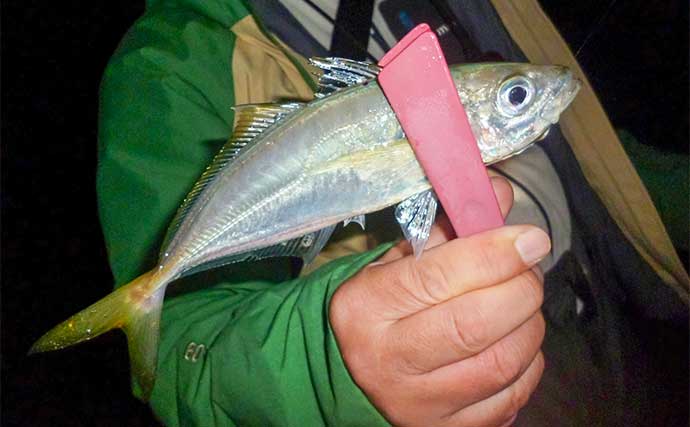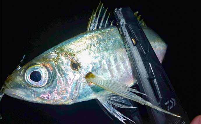 メッキもゼイゴがあるのでアジといえばアジなのだが、メタルジグでアジをキャッチするのは私も初めて見た。しかもまだ明るい。ジグの重さを聞くと3gとのこと。