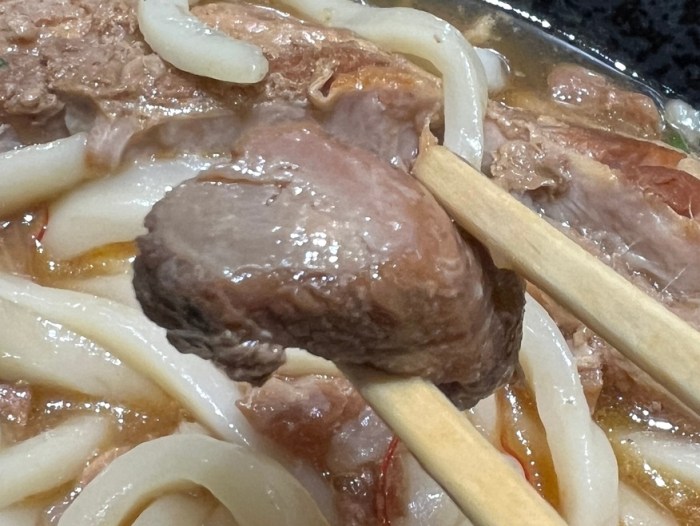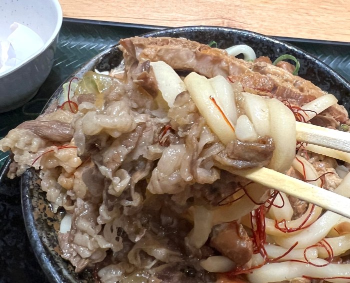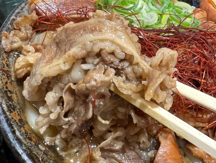 これはもう一口でわかった。完全に「うどん」の概念を超えている。肉の旨味が口いっぱいに広がり、その下に隠れているコシのある讃岐うどんが絶妙に絡み合う。