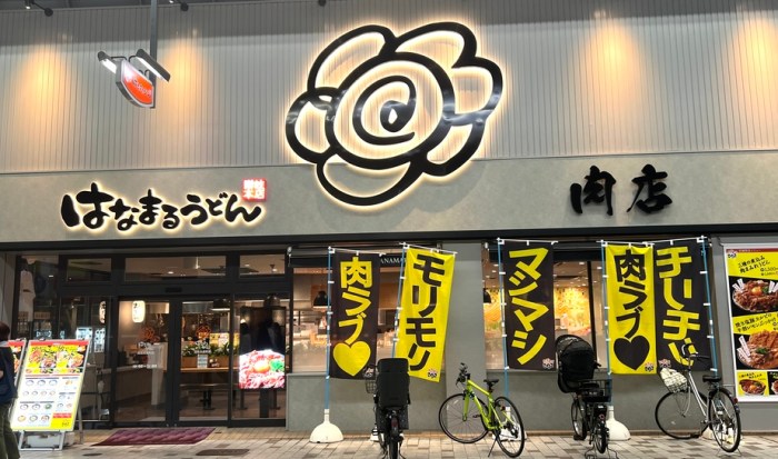 「煩悩を解放せよ!!!」「肉ラブ」「マシマシ」など、通常のはなまるうどんでは絶対に見ることのない文字がズラリと並んでいる。看板をよく見ると『はなまるうどん 肉店』と、聞いたことのない店名。