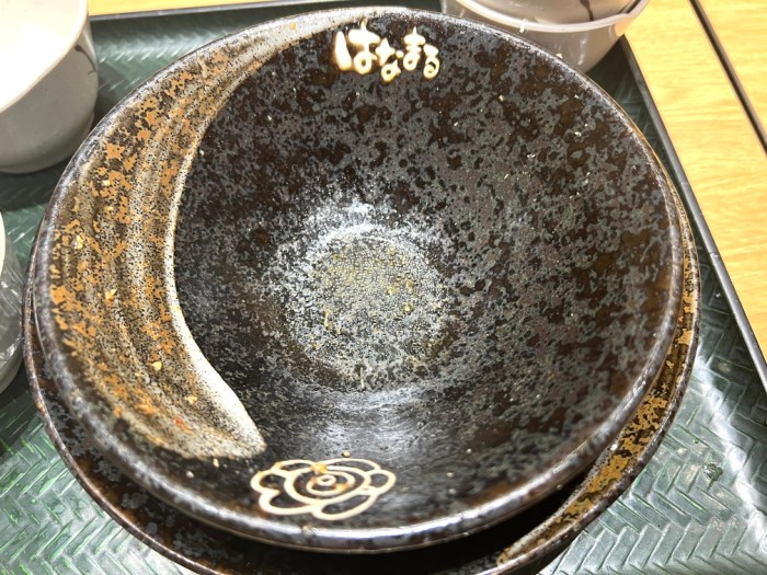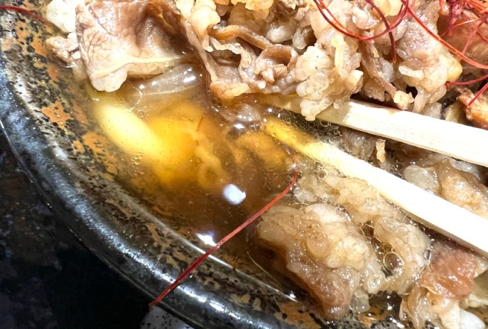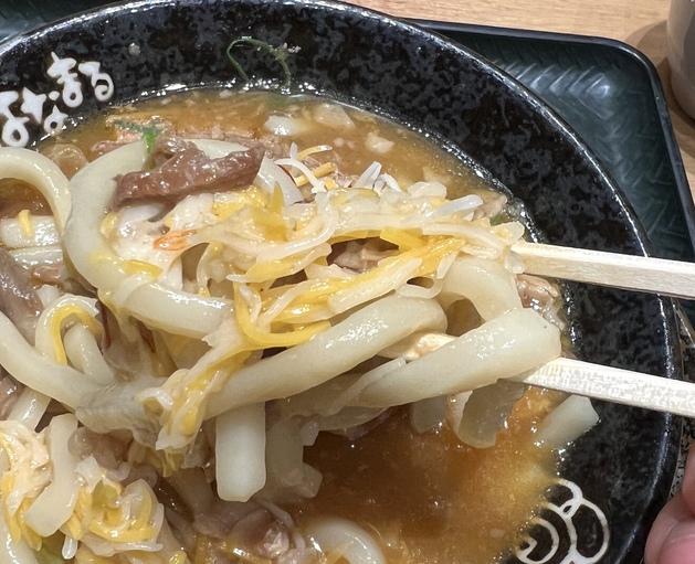 アッサリ系の讃岐うどんのスープも、肉の油でコクのある濃厚なスープに変貌している。通常のはなまるうどんとは、まったく別の料理と言っても過言ではない。
