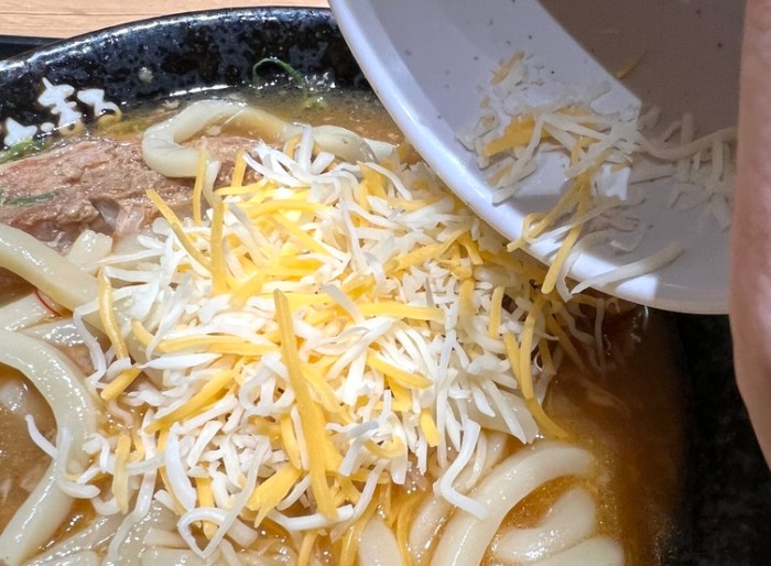 スプーンでチーズを絡めながら、麺とスープを一気にすすっていく。これまで食べてきたどんなうどんとも違う、新しいうどん体験だった。さすがにこのボリュームはキツいと思っていたが、意外にも箸が止まらない。