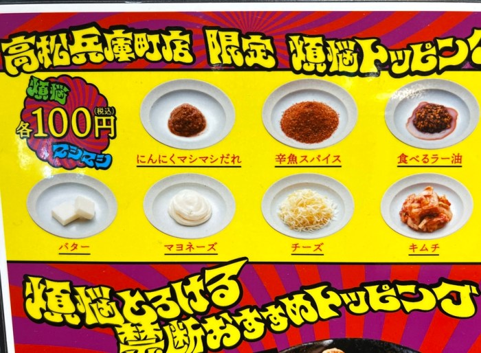 店頭は「煩悩」をテーマにした、のぼりやメニューがズラリと並び、通常のはなまるうどんとは一線を画した雰囲気だ。