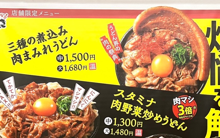 特に目を引くのは、店舗限定の4種類の肉メニュー。圧倒的なボリュームや多様なトッピングなど、うどん業界ではあまり見られない「デカ盛り系」の魅力を讃岐うどんで楽しめるらしい。