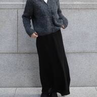 インナーとジャケットを同系色でそろえることで、すっきりとした縦のラインが強調され、全体に統一感が生まれます。