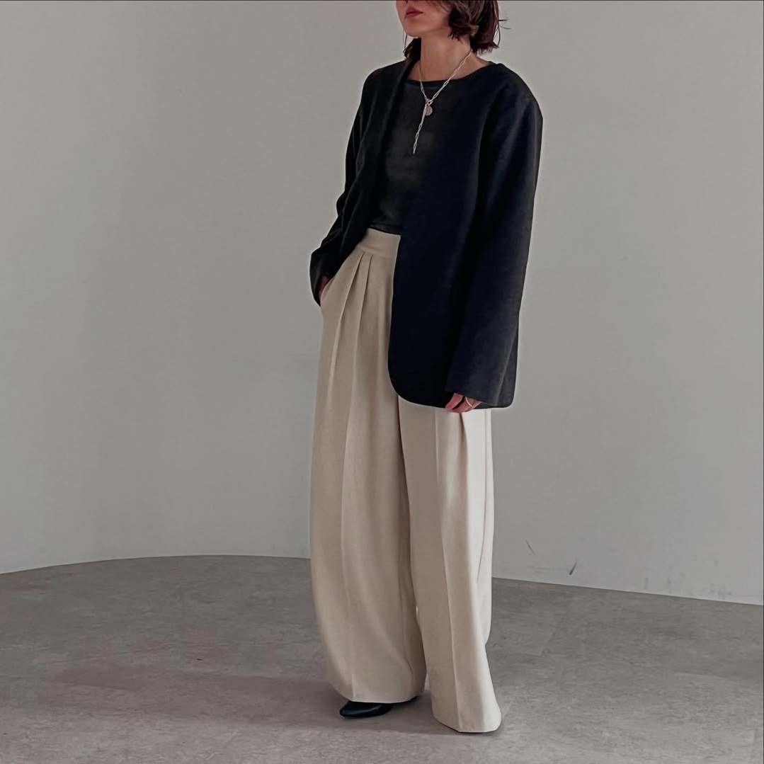 黒ジャケットに同色のインナーを合わせて、白のワイドパンツでまとめたモノトーンコーデは、シンプルながらも洗練された印象に仕上がります。