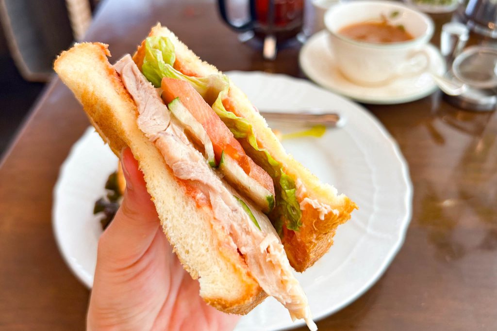 柔らかしっとりパシモンチキンと、たっぷりお野菜、ほんのりケチャップを思わせるまろやかなソースが挟んであります。トーストとの相性抜群で幸せ。