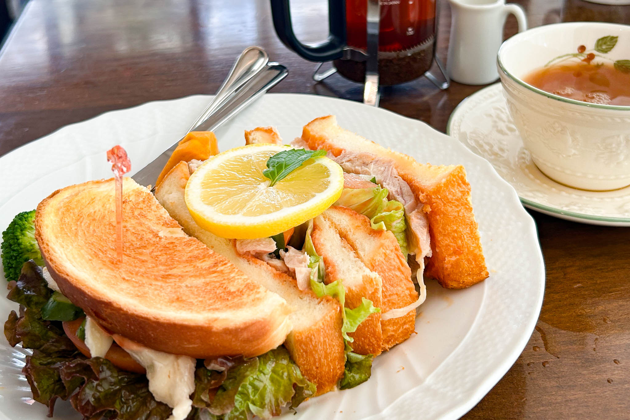 パシモンチキンサンドと、セットでセイロンティー(715円からセットで50円引き)をいただくことに。